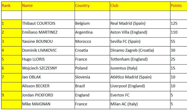 وتفوّق كورتوا، الذي فاز بالجائزة للمرة الثانية في تاريخه، على حارس أستون فيلا الدولي الأرجنتيني إيميليانو مارتينيز، الذي أحرز مع منتخب بلاده لقب كأس العالم 2022 في قطر، فيما حل حارس مرمى إشبيلية والمنتخب المغربي ياسين بونو في المركز الثالث، ليدخل التاريخ، بعدما بات أول حارس أفريقي يحتل أحد المراكز الثلاثة الأولى.