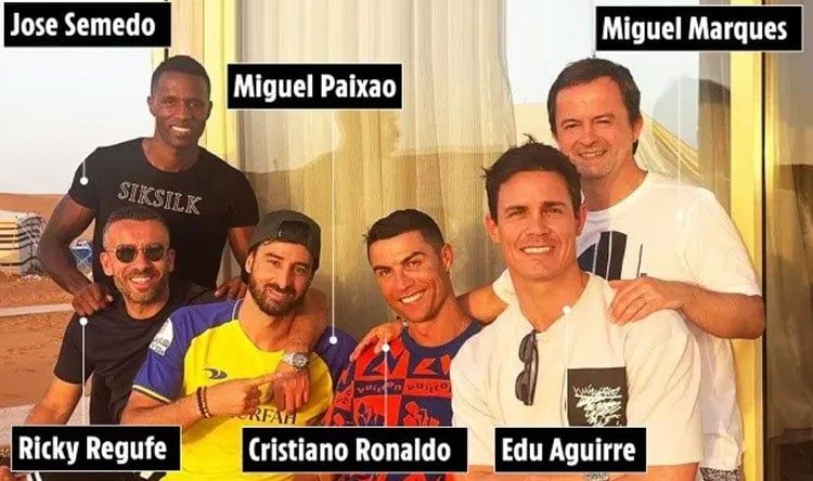 وفي الصورة يتواجد ميغيل ماركيز الذي يدير أصول مهاجم النصر السعودي، إضافة إلى أصدقائه القدامى ميغيل بايكساو وخوسيه سيميدو، الأول كان رفيق رونالدو في السكن بأكاديمية سبورتينغ لشبونة، بينما وصف رونالدو سابقا سيميدو بـ” أحد أفضل الأصدقاء”.