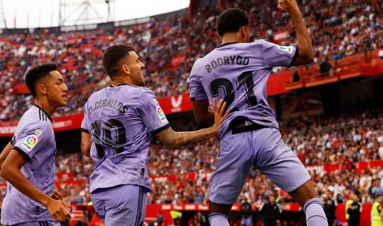 سجل رودريغو هدفين ليقود ريال مدريد لتحويل تأخره إلى فوز 2-1 على مضيفه إشبيلية، الذي أكمل اللقاء بعشرة لاعبين، ليعزز موقعه في المركز الثاني بدوري الدرجة الأولى الإسباني لكرة القدم.