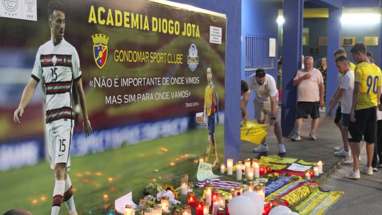 خارج أكاديمية نادي غوندومار الرياضي، حيث بدأت مسيرة جوتا الكروية، ازدانت الأرصفة بالزهور والشموع والقمصان والأوشحة، بينما توافد الأهالي لتكريم نجمي البلدة.