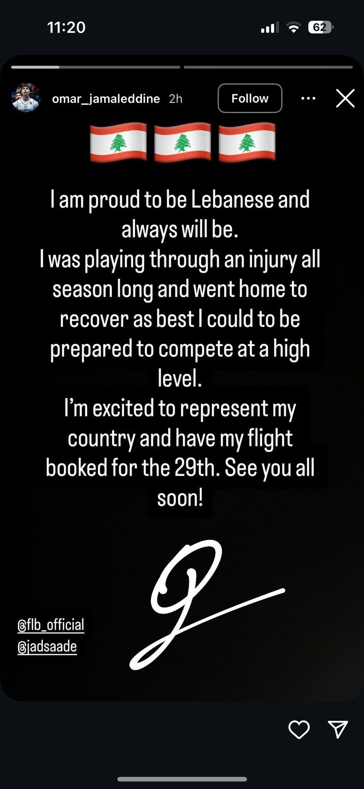 وعبر ستوري حسابه على "إنستغرام"، كتب جمال الدين: "أنا فخور لأنني لبناني، وسأبقى كذلك. لقد لعبت مصابًا طوال الموسم وعدت إلى المنزل للاستراحة قدر الإمكان للاستعداد للمنافسة مجددًا على أعلى مستوى".