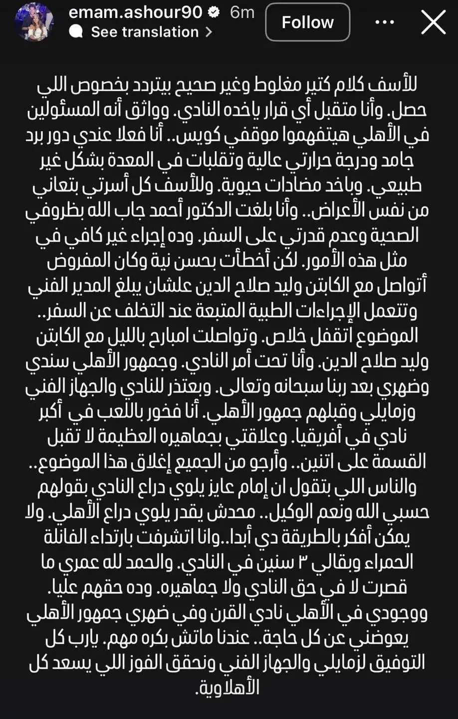 وقال إمام عاشور عبر حسابه على إنستغرام: "للأسف، هناك كلام كثير مغلوط وغير صحيح يتردد بشأن ما حدث مؤخرًا، وأنا متقبل تمامًا أي قرار يتخذه النادي، وواثق أن مسؤولي الأهلي سيفهمون موقفي جيدًا. الحقيقة أنني أعاني من برد شديد ودرجة حرارة مرتفعة، بالإضافة إلى تقلبات غير طبيعية في المعدة، وأتناول مضادات حيوية، وللأسف كل أسرتي تعاني من نفس الأعراض. لقد أبلغت الدكتور أحمد جاب الله بظروفي الصحية وعجزت عن السفر، وأعلم أن هذا الإجراء قد لا يكون كافيًا في مثل هذه الحالات".