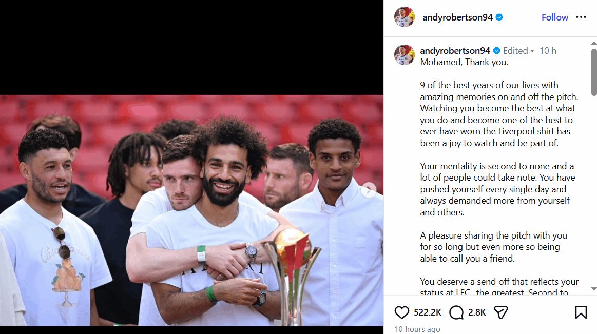 ولم يقتصر التفاعل على لاعبي ليفربول الحاليين، بل شمل أيضاً نجوماً سابقين رافقوا صلاح في سنوات التألق. فقد عبّر ترينت ألكسندر أرنولد عن امتنانه الكبير، مشيراً إلى قوة العلاقة التي جمعته بصلاح داخل الملعب وخارجه، كما انضم جوردان هندرسون إلى رسائل الوداع واصفاً إياه بـ"الملك".