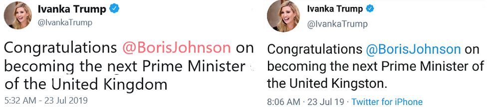ثم بقيت Kingston مستمرة أكثر من 3 ساعات على مرأى 6 ملايين و700 ألف "تويتري" يتابعون حسابها، إضافة إلى غيرهم ملايين قرأوها بحسابت من أعادوا تغريدها، إلى أن تنبهت إيفانكا، أو ربما "أدمن" صفحتها، إلى الخطأ غير المقصود، فأسرعوا وصححوه، ولكن بعد فوات الأوان، لأن صورة التغريدة المتضمنة الخطأ، وعثرت عليها "العربية.نت" بسهولة، كانت قد انتشرت "أونلاين" في مواقع التواصل وكل مكان، وخطفت الأضواء حتى أكثر مما قاله دونالد ترمب نفسه عن جونسون.