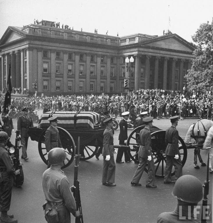 صورة لمرور موكب جنازة الرئيس فرانكلن روزفلت أمام الجماهيرفي حدود الواحدة ظهرا من نفس ذلك اليوم، انهمك فرانكلن روزفلت في قراءة الصحف وكتابة الرسائل وتواجدت بقربه الرسّامة إليزابيث شوماتوف التي أوكلت إليها مهمة إعداد لوحة زيتية للرئيس.