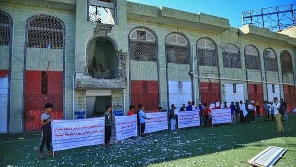 نفذ ناشطون وقفة احتجاجية أمام مقر النادي الأهلي في مدينة تعز، جنوب غربي اليمن، اليوم الأحد، والذي تعرض لقصف بقذيفة هاون أطلقتها ميليشيا الحوثي الانقلابية.