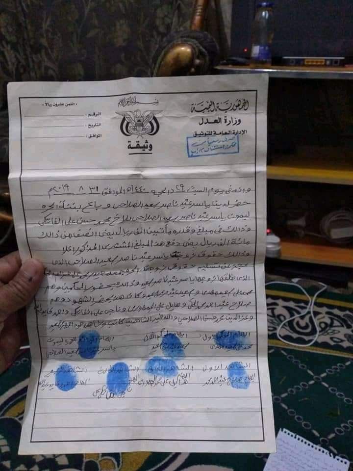وتداول ناشطون على مواقع التواصل الاجتماعي وثيقة وصورة مختومة بختم رسمي وشهود تتحدث عن حادثة بيع أب يمني لطفلته، في محافظة إب وسط البلاد والخاضعة لسيطرة الحوثيين.
