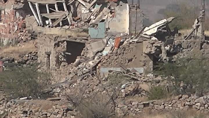 وتداول ناشطون على مواقع التواصل الاجتماعي صورا تظهر آثار منازل مدمرة في منطقة مدرات، التي تعد منطقة تماس بين قوات الحكومة الشرعية وميليشيا الحوثي الانقلابية في جبهة غربي تعز.