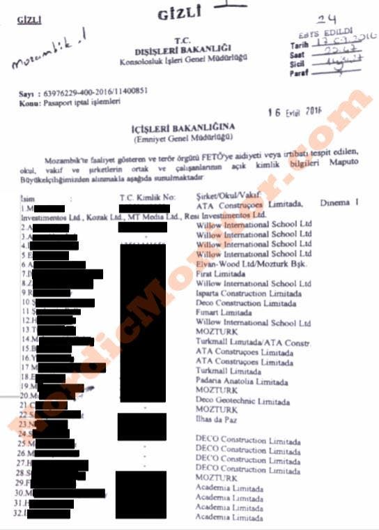 وكشف الموقع، أنه حصل على برقية دبلوماسية سرية من السفارة التركية في مابوتو، بتاريخ 16 سبتمبر 2016، مرسلة إلى مقر الخارجية التركية في أنقرة، تتضمن أسماء 32 تركيا ومدرسة دولية تُعتبر من بين الأفضل في موزمبيق، إضافة إلى شركات دشنها أتراك هناك.