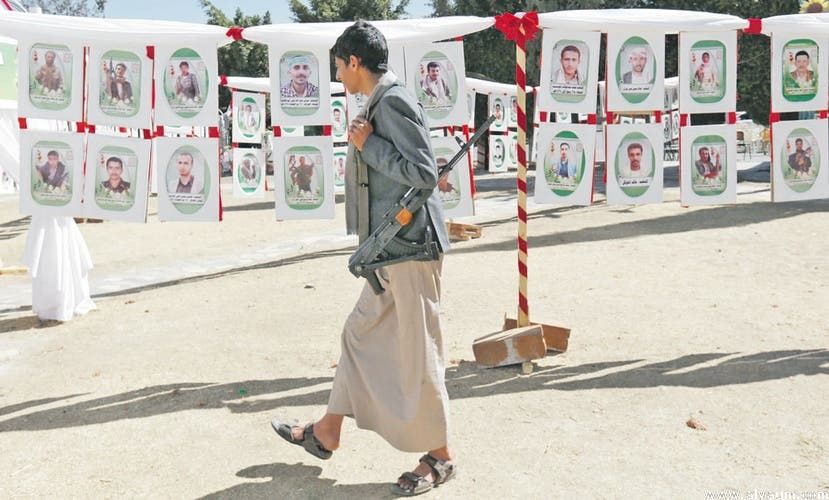 مسلح حوثي يمر بالقرب من صور قتلى الميليشيا في ذمار (أرشيفية)