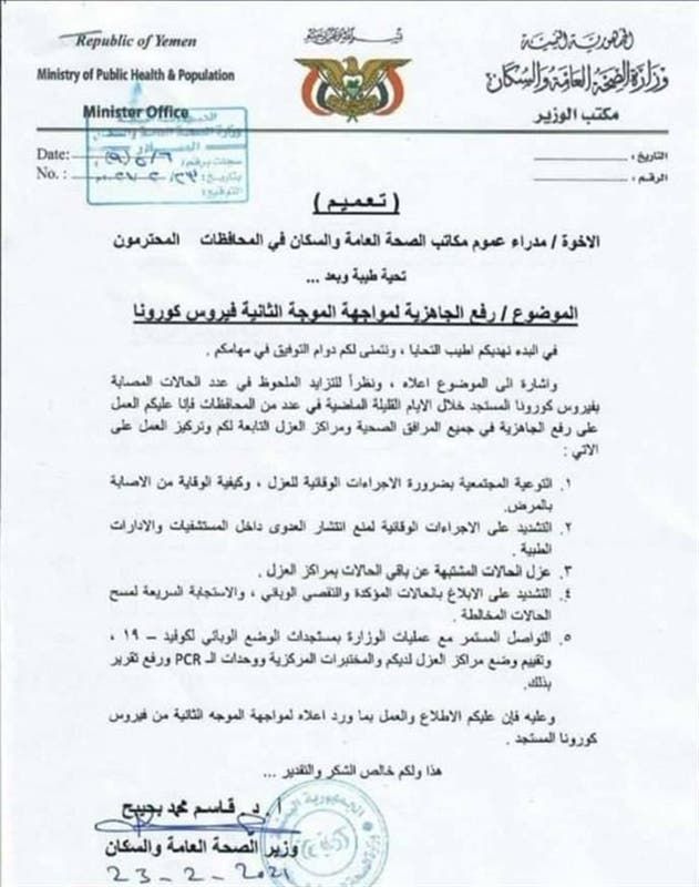 وأكد التعميم ضرورة الحرص على رفع الجاهزية في جميع المرافق الصحية ومراكز العزل واتخاذ جملة من التدابير الصحية اللازمة لمنع انتشار الفيروس.