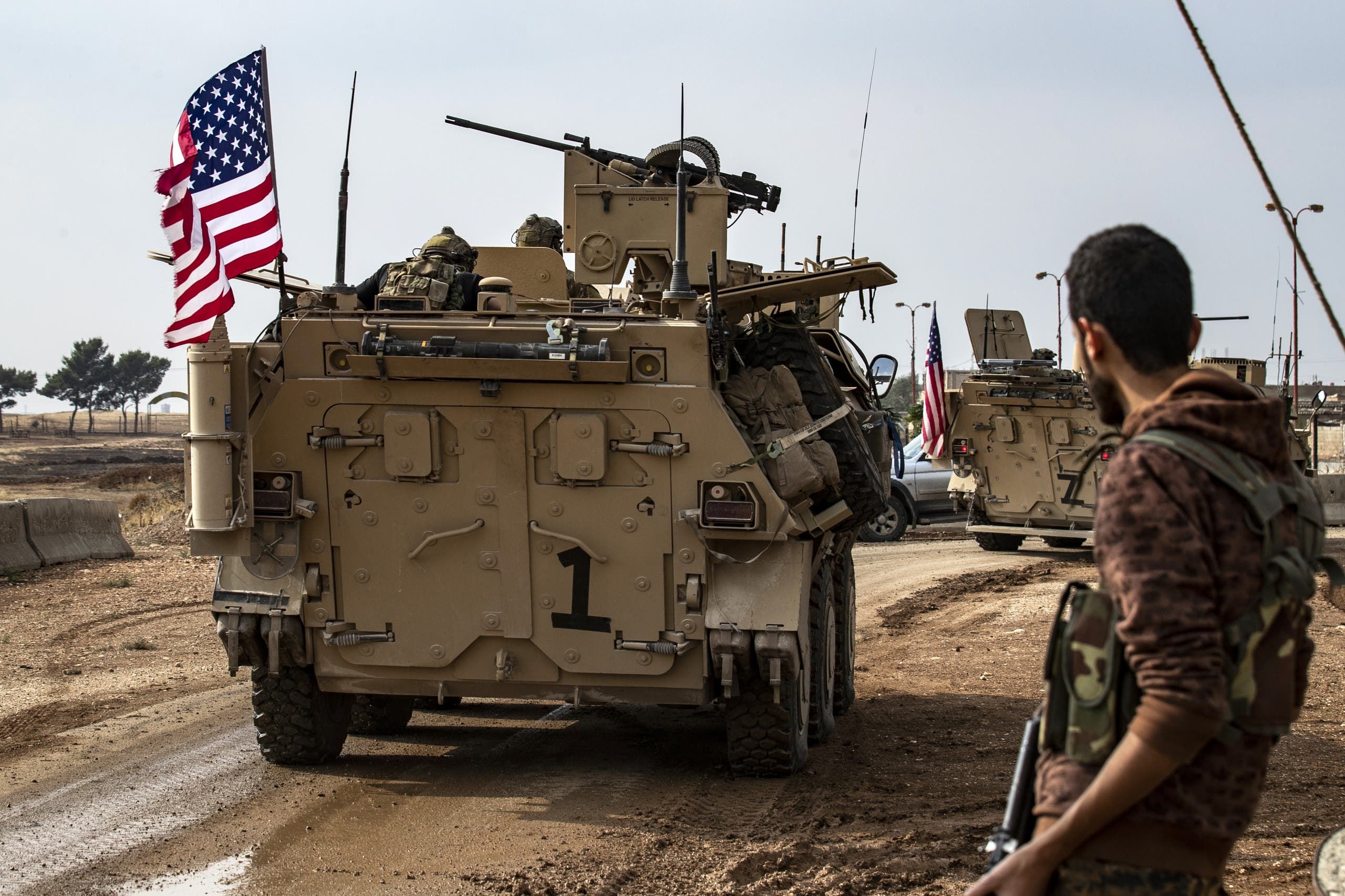عنصر من قوات سوريا الديمقراطية إلى جانب آلية أميركية شمال سوريا(فرانس برس)