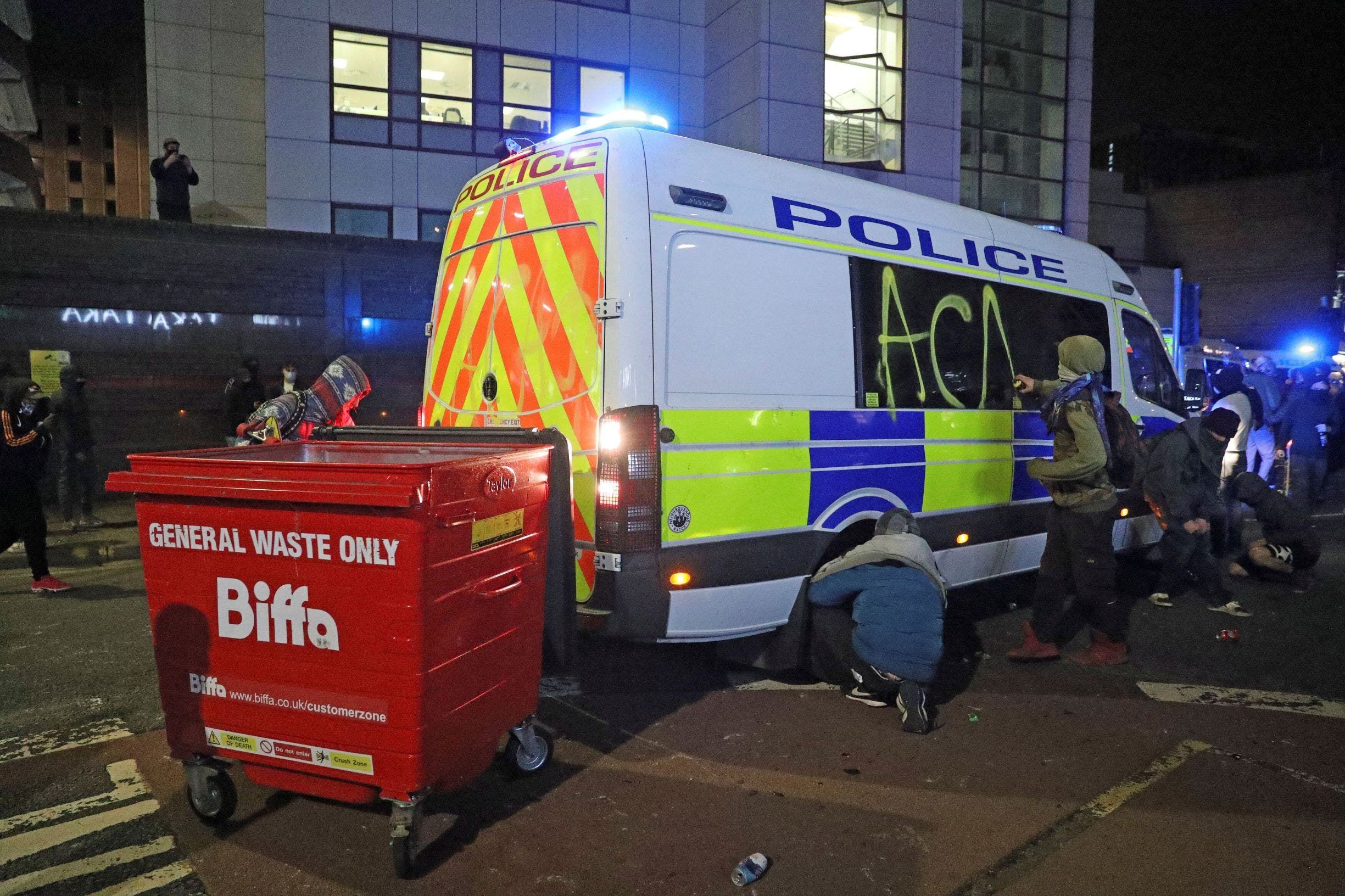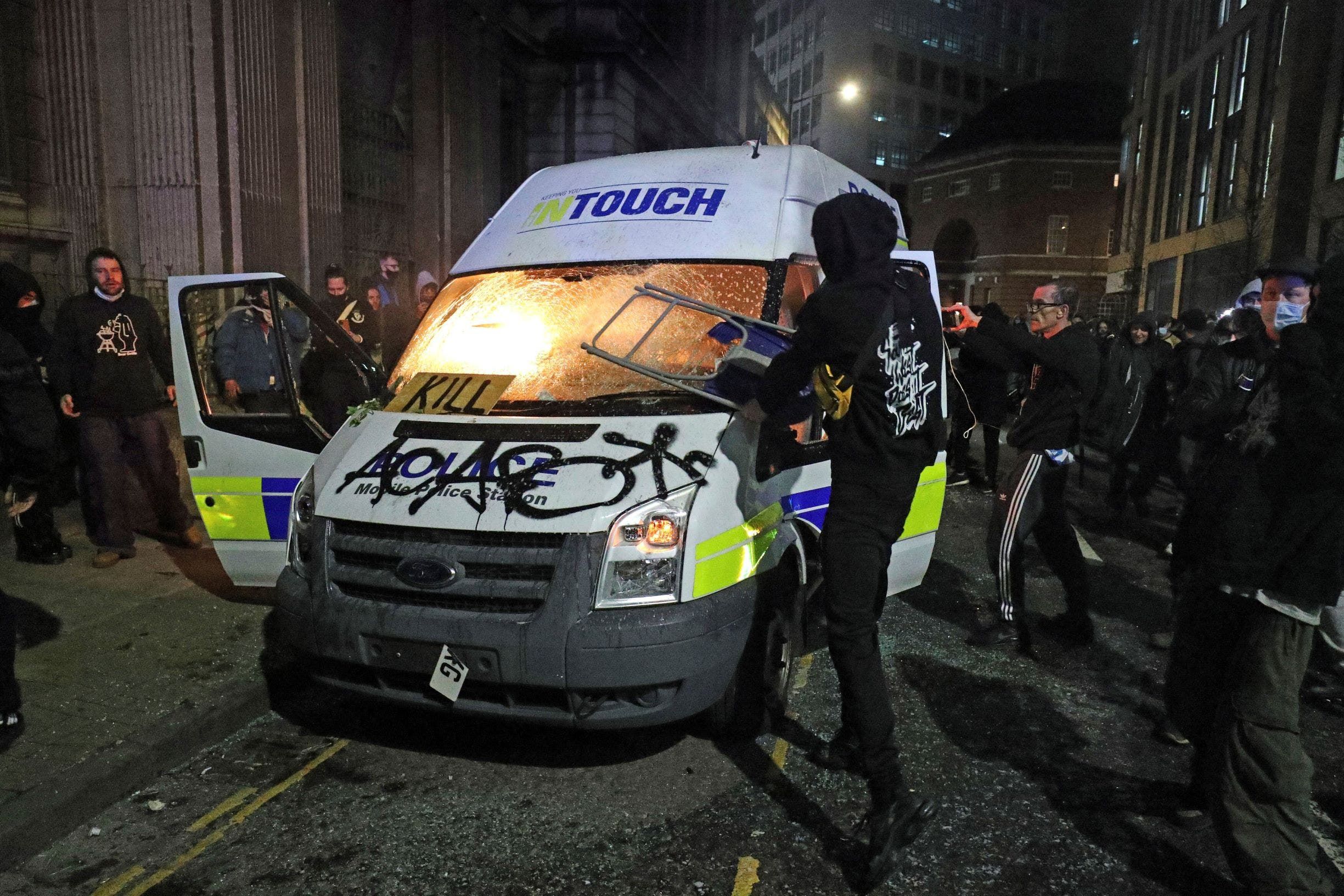قالت الشرطة البريطانية إن شرطيين أصيبا بجروح خطيرة وأضرمت النار في سيارتي شرطة على الأقل في مدينة بريستول جنوب غرب إنجلترا خلال أعمال عنف بعد احتجاج سلمي.