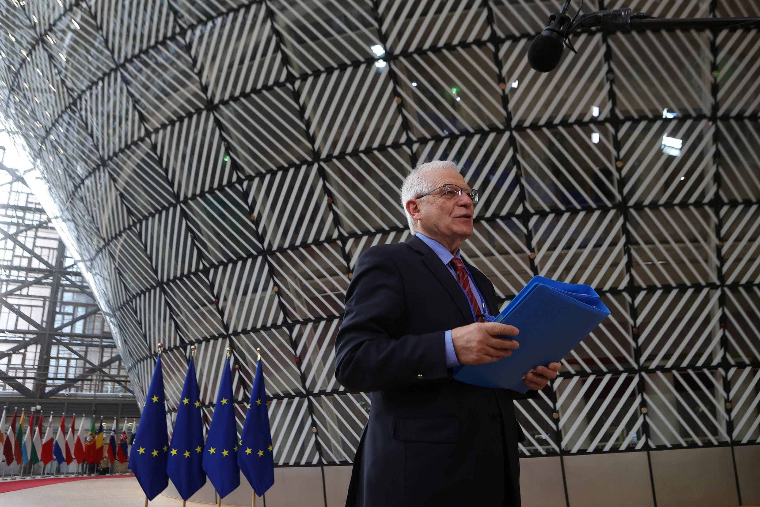 بوريل عند وصوله للمشاركة في الجلسة اليوم في بروكسل