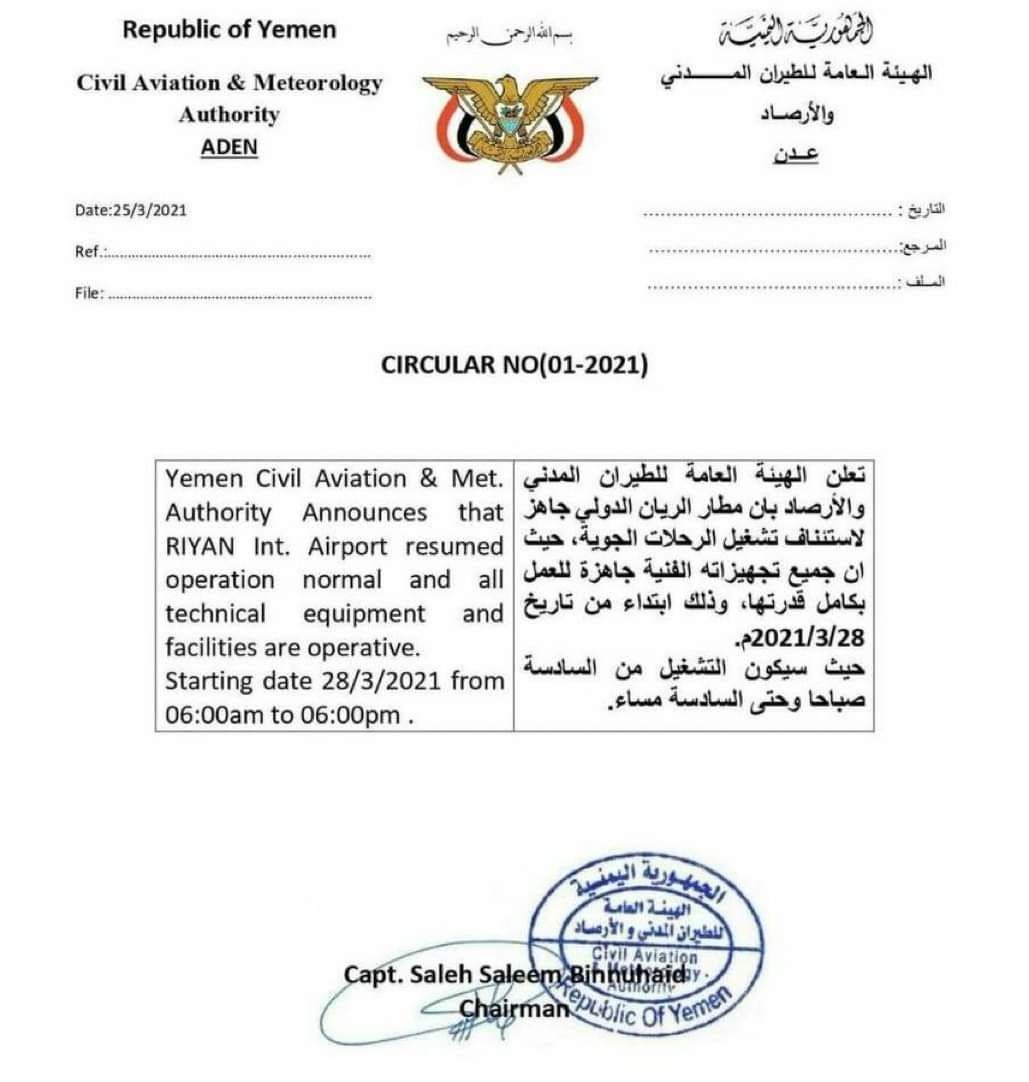 وأكدت وثيقة صادرة عن الهيئة العامة للطيران المدني والأرصاد "أن مطار الريان الدولي، سيكون جاهزاً لاستقبال ومغادرة الرحلات الجوية المدنية، ابتداءً من يوم الأحد القادم 28 مارس 2021م".