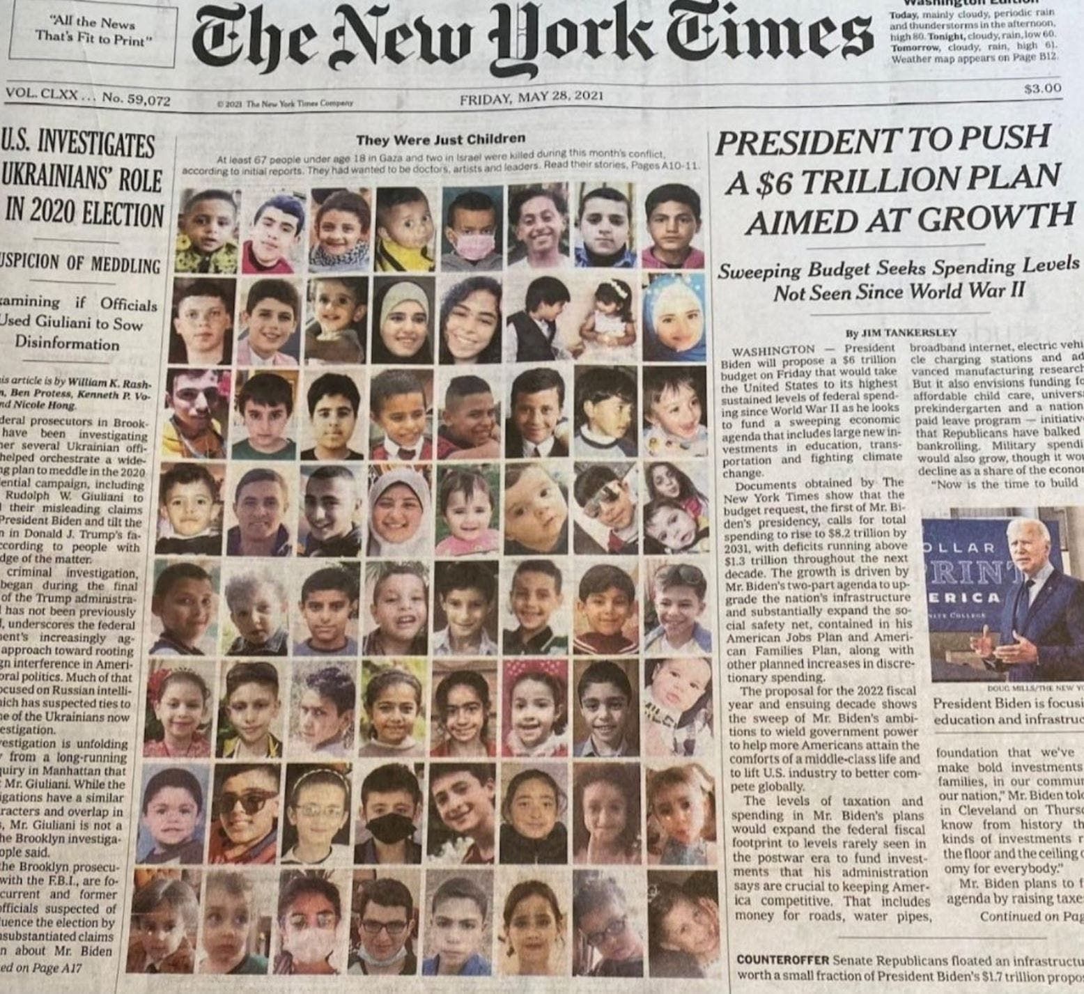 "كانوا مجرد أطفال"، بهذه العبارة عنونت صحيفة "نيويورك تايمز" الأميركية تقريراً على صفحتها الرئيسية، تضمن أسماء وصور وتفاصيل عن حياة الأطفال الفلسطينيين الذين قضوا خلال الغارات الإسرائيلية الأخيرة على قطاع غزة.