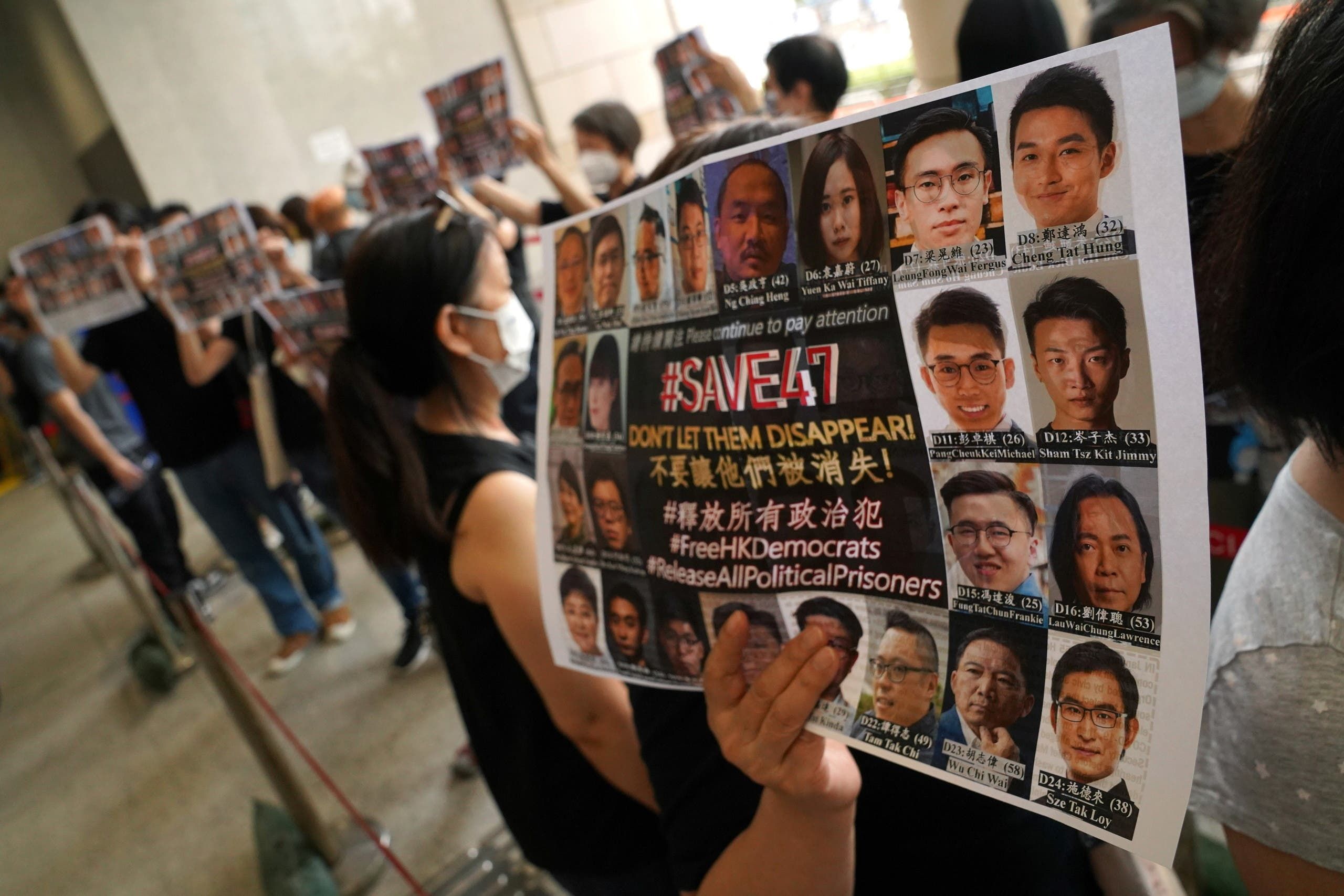 رفع لافتة في هونغ كونغ تحمل صور ناشطين تلاحقهم السلطات لمطالبتهم بالديمقراطية