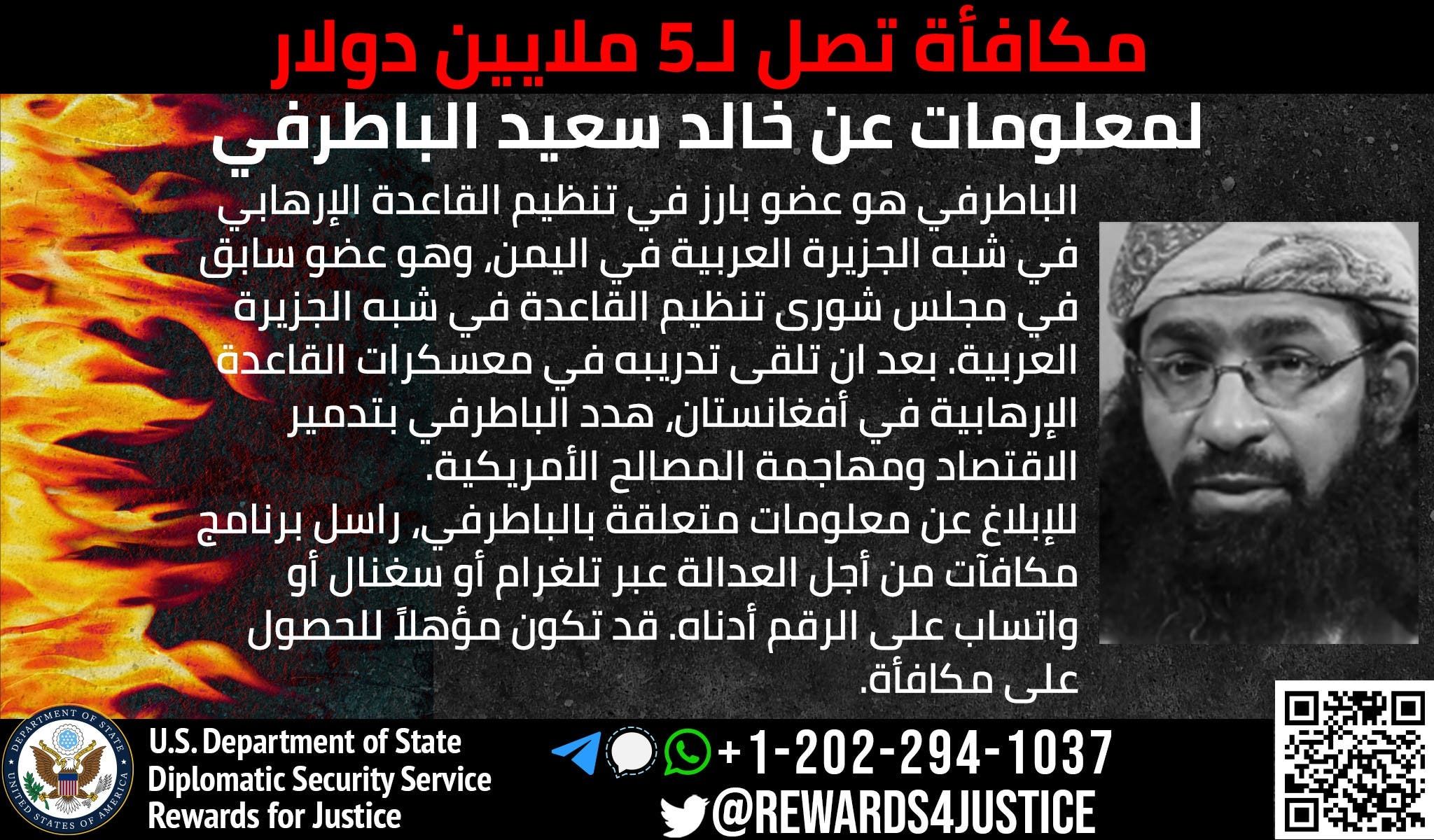 أعلن برنامج "مكافآت من أجل العدالة"، التابع لوزارة الخارجية الأميركية، اليوم الأربعاء، مكافأة مالية تصل إلى خمسة ملايين دولار مقابل الإدلاء بمعلومات تقود لزعيم تنظيم القاعدة في اليمن خالد باطرفي.