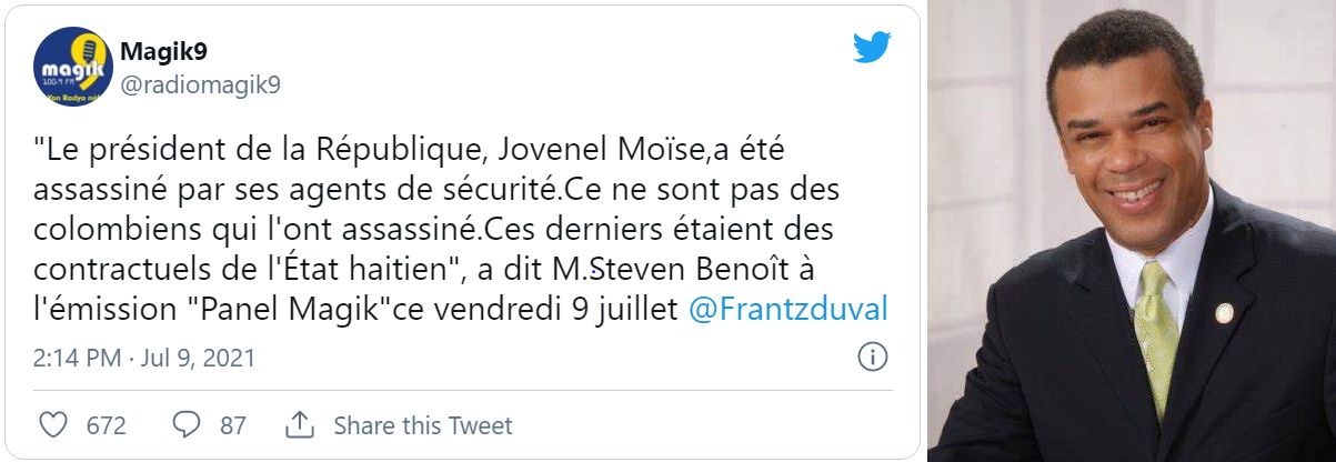 ما روته الصحيفة من معلومات زودها بها صحافي هايتيني، ملم بالتحقيقات وتعاقدت معه ليتفرغ للمهمة، يتطابق فيما لو صح، مع ما قاله سناتور معارض أمس الجمعة لمحطة Magic9 الإذاعية في هايتي، ووجدت "العربية.نت" تغريدة في حسابها التويتري لما ذكره لها Steven Benoit من معلومات، وهو أن "الرئيس قتله أعوانه الأمنيون، وليس الكولومبيون هم من اغتالوه. إنهم متعاقدون مع الحكومة" بحسب ما نقرأ في التغريدة المنشورة صورتها أعلاه، قيما تساءلت الصحيفة عما إذا كان الكولومبيون وقعوا بفخ منصوب من نوع ما.