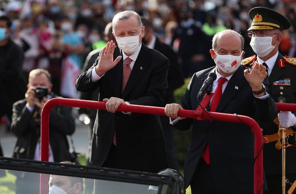 رجب طيب أردوغان ورئيس جمهورية شمال قبرص التركية أرسين تتار في فاروشا- فرانس برس