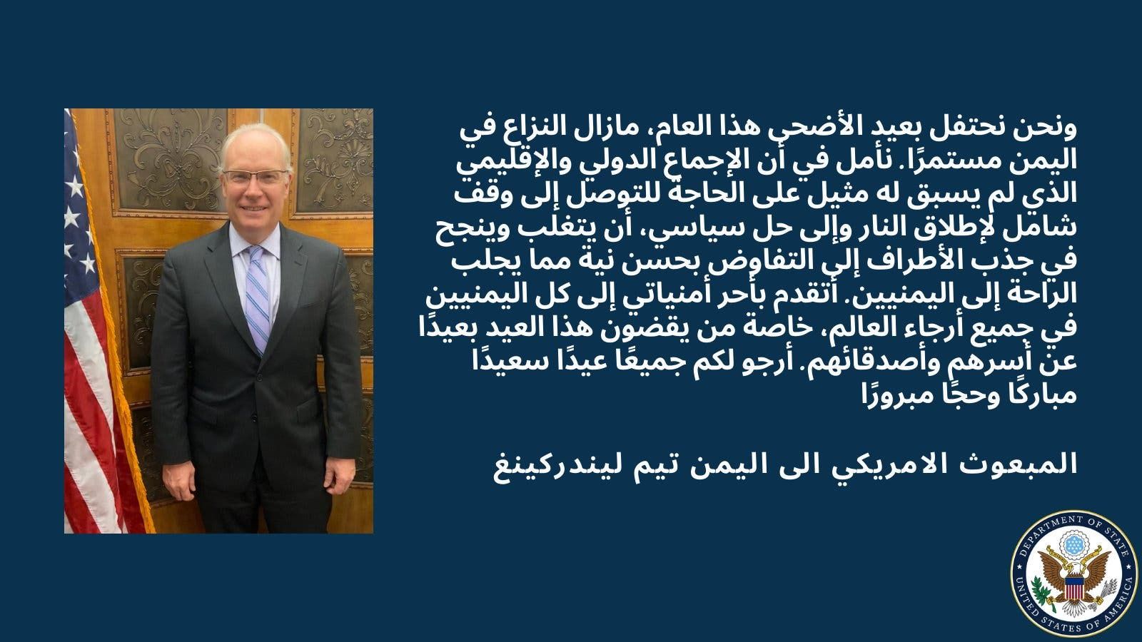 وتمنى المبعوث الأميركي "لكل اليمنيين في جميع أرجاء العالم، خاصة أولئك الذين يقضون هذا العيد بعيدا عن أسرهم وأصدقائهم.. عيد سعيداً وحجاً مبروراً".