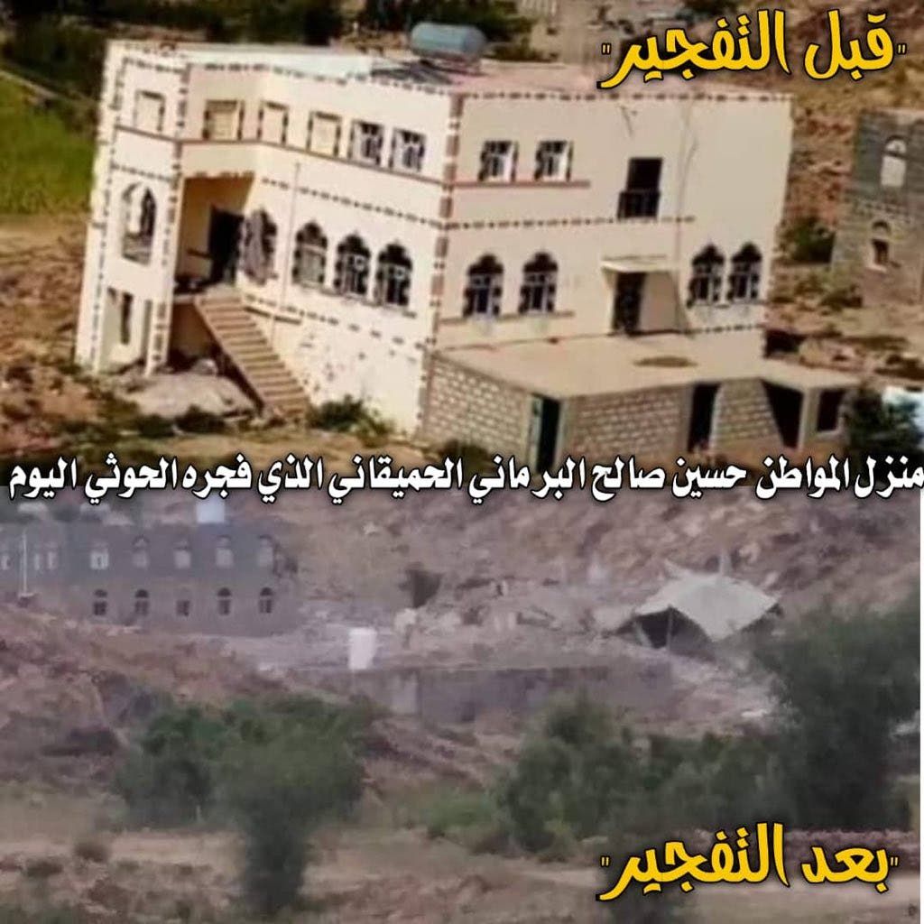 وأفاد وزير الإعلام اليمني معمر الإرياني بأن ميليشيا الحوثي المدعومة من إيران قامت بتفجير منزل المواطن حسين صالح البرماني الحميقاني بمديرية الزاهر آل حميقان بمحافظة البيضاء.
