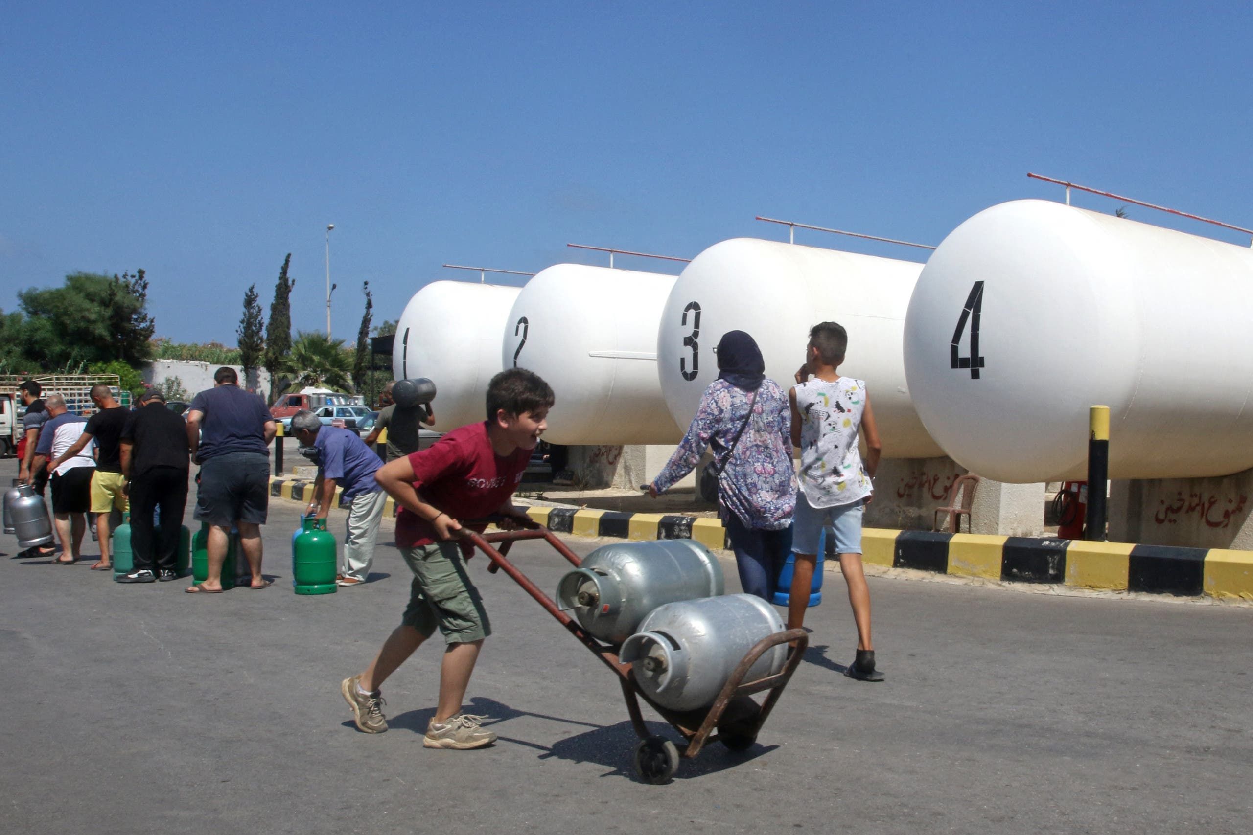 لبنانيون ينتظرون ملء اسطوانات الغاز في صيدا يوم 10 أغسطس (فرانس برس)