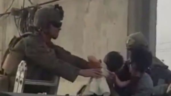 كما أظهر الفيديو جنديا أميركيا يحمل رضيعة أفغانية من ذويها، ويدخلها إلى الجهة الأخرى، فيما يحتشد المئات يتوسلون للحاق بها.