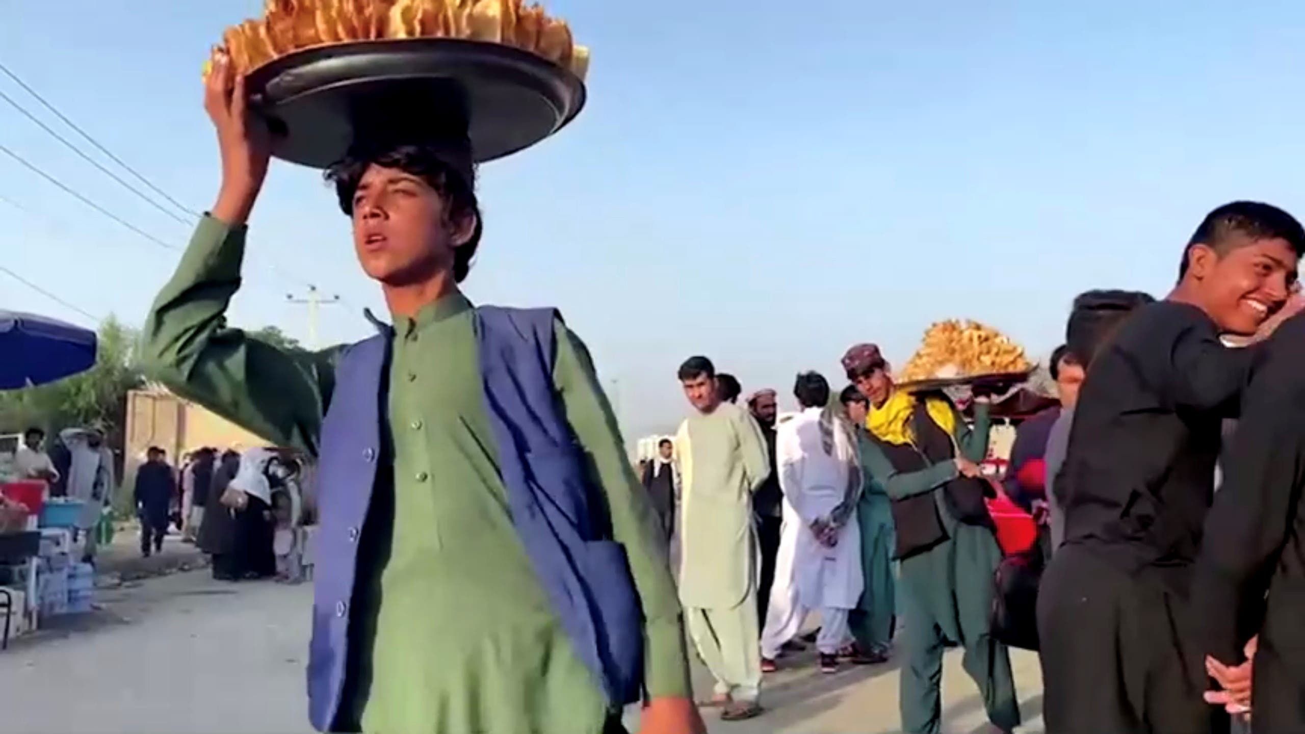 بائع متجول يعرض المأكولات على المنتظرين أمام مطار كابل