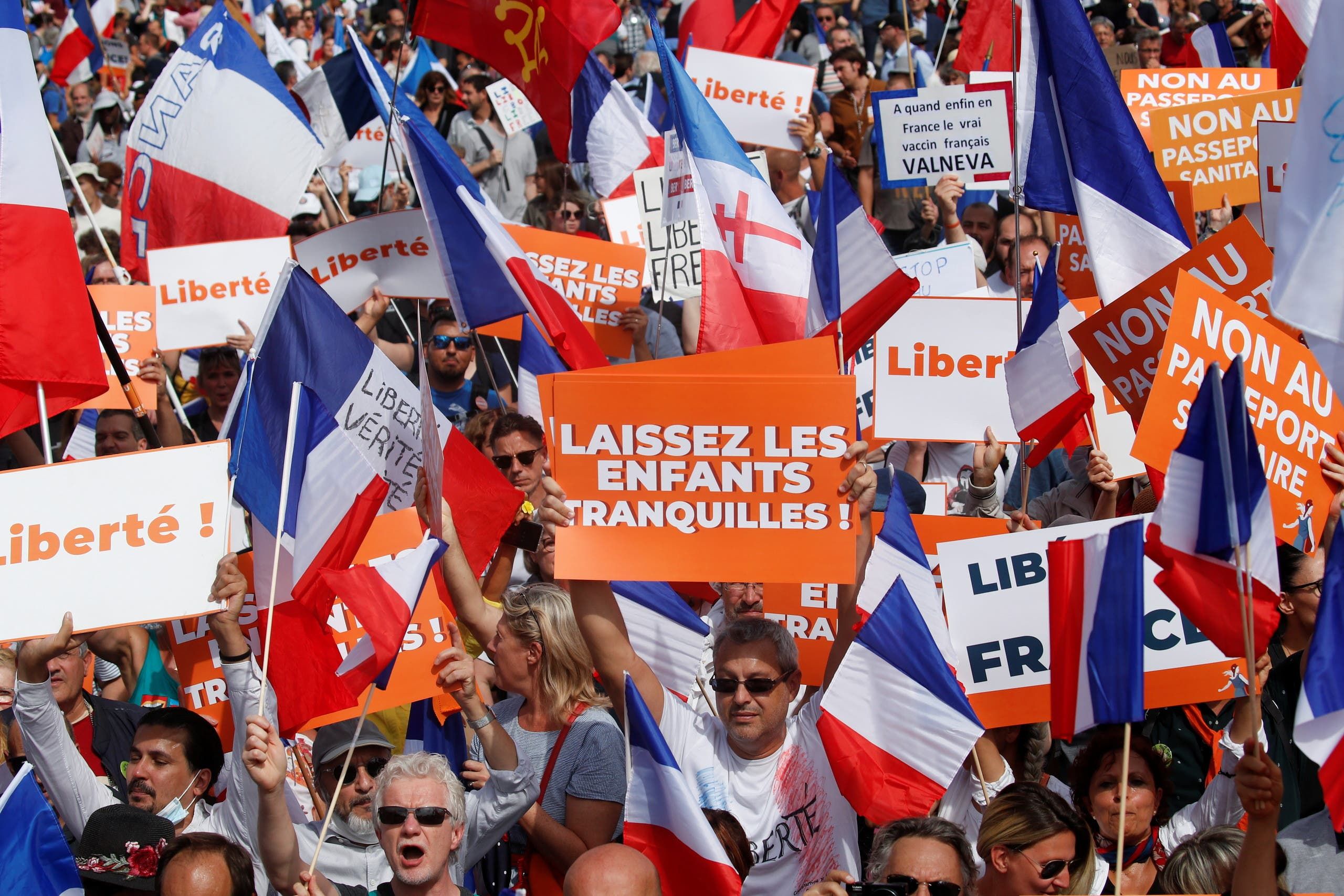 وفي مرسيليا (جنوب)، انطلق آلاف الأشخاص من الميناء القديم، معظمهم بدون كمامات، تحت أشعة الشمس حاملين الأعلام الفرنسية. وكُتب على لافتة "لا للتصريح الصحي. لا للتمييز. لا للترهيب. حرية".