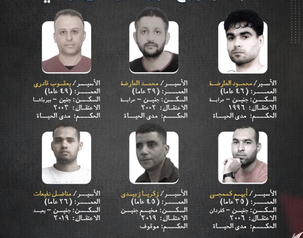 وكانت صحيفة "جيروزاليم بوست" الإسرائيلية أفادت، الجمعة، بالقبض على اثنين من الفلسطينيين الستة الذين فروا من سجن جلبوع في مدينة الناصرة، هما محمود عبد الله عارضة ويعقوب محمود قادري من حركة الجهاد الإسلامي.