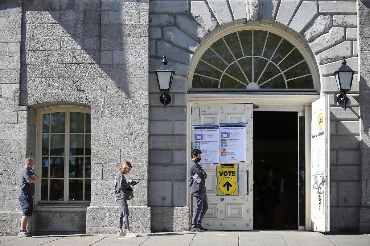 ناخبون ينتظرون خارج أحد مراكز الاقتراع بكندا (رويترز)