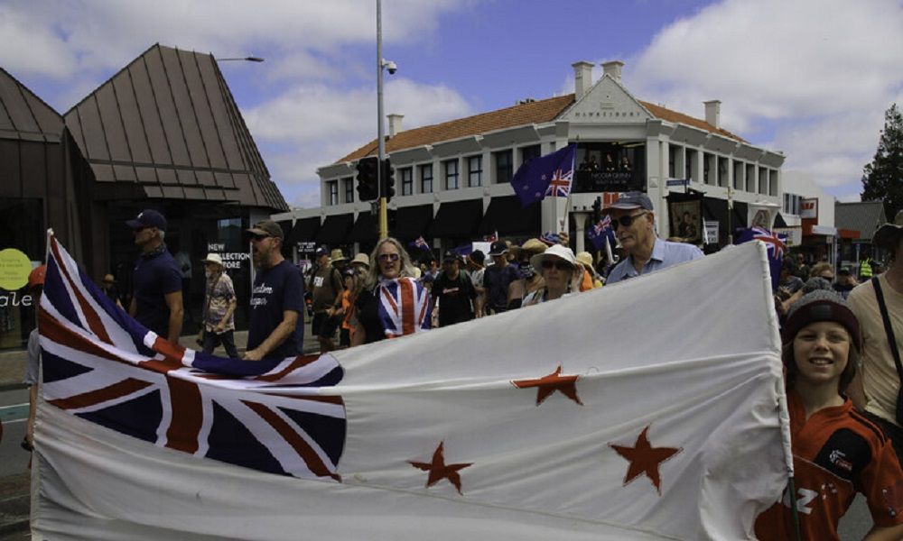 احتج متظاهرون مناهضون للتطعيم ضد كوفيد-19 في الشوارع خارج البرلمان في العاصمة ويلينغتون بنيوزيلندا اليوم الأحد.