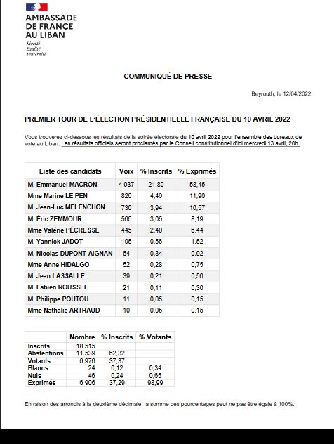 اصدرت السفارة الفرنسية في بيروت، بعد انتهاء الجولة الاولى من الانتخابات الرئاسية الفرنسية وتأهل المرشحين ايمانويل ماكرون ومارين لوبن الى المرحلة الثانية، نتائج الانتخابات التي حصلت في لبنان، والتي حصل عليها الرئيس الفرنسي المنتهية ولايته ايمانويل ماكرون على المركز الاول بـ 4037 صوتا في حين حصدت المرشحة مارين لوبن على 826 صوتا.