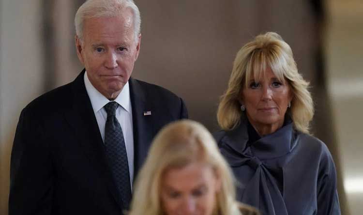 لكن بايدن بدا متفهما للموقف، إذ ظهر وهو مبتسم، بينما كان يمسك يد زوجته التي ارتدت اللون الأسود حدادا على الملكة إليزابيث الثانية.