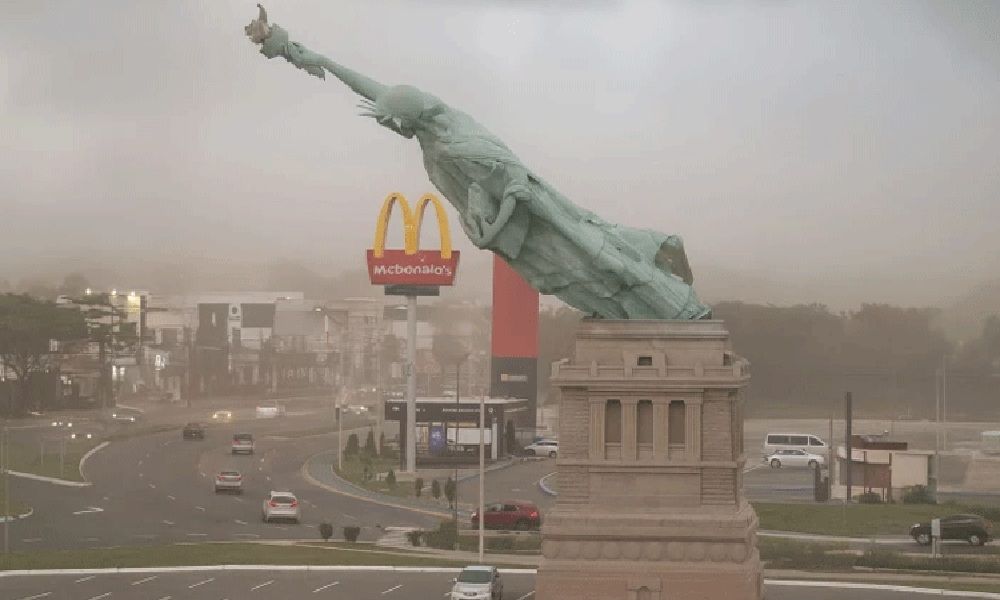 وثق مقطع فيديو لحظة سقوط نسخة مقلدة من تمثال الحرية في مدينة غوايبا بالبرازيل، بعد تعرضه لرياح قوية ناجمة عن موجة طقس سيئ ضربت المنطقة.