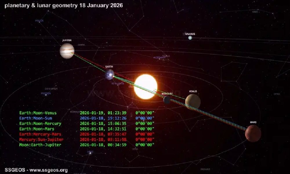 أثار راصد الزلازل الهولندي فرانك هوغربيتس جدلًا واسعًا، بعد أن نشر مساء أمس السبت صورة تُظهر اصطفاف عدد من الكواكب، بينها الزهرة وعطارد والمريخ والمشتري، واقترانها مع الأرض والشمس والقمر، مشيرًا إلى أن هذه الظاهرة تُعرف بـ«هندسة الكواكب» التي يشهدها الفضاء اليوم الأحد 18 كانون الثاني.