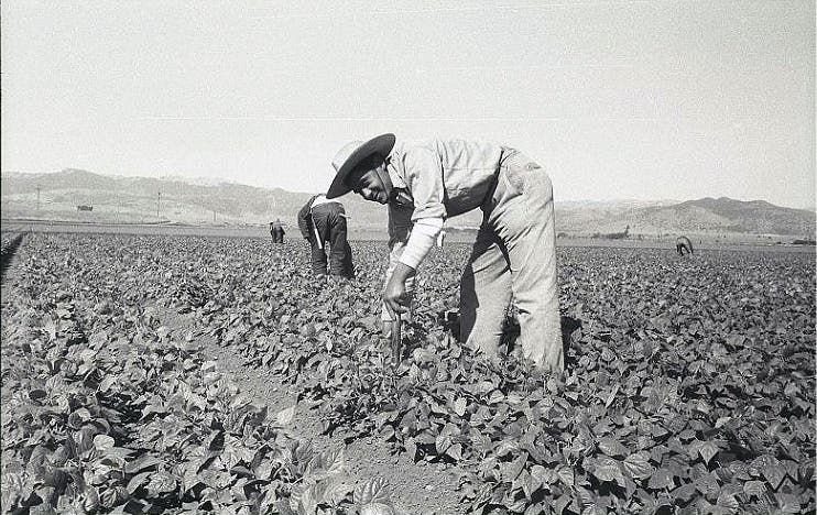 صورة لأحد المهاجرين المكسيكيين أثناء فترة عمله بإحدى المزارع الأميركيةوخلال فترة الحرب العالمية الثانية، فضّلت الولايات المتحدة الأميركية تخفيف القيود على هجرة المكسيكيين، تزامناً مع تراجع عدد العمال الأميركيين الذين أجبروا على الالتحاق بالجيش للقتال بأوروبا والمحيط الهادئ. كما عمدت السلطات الأميركية سنة 1942 لإقرار برنامج براسيرو (Bracero Program)، والذي اتجهت بموجبه لاستقطاب ما يزيد عن 300 ألف مكسيكي لمجابهة النقص الحاد في اليد العاملة.