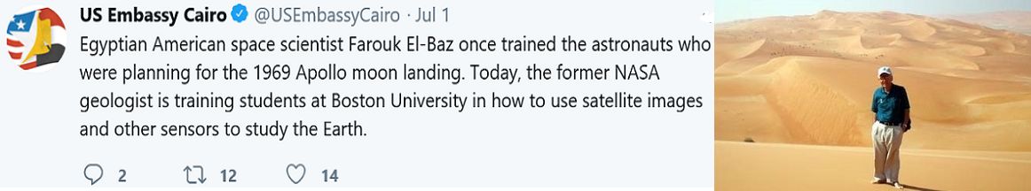 وممن أعطوا للدكتور الباز بعض حقه حين بدأت تقترب مناسبة نزول أول إنسان إلى أديم القمر، ولو بالكلام، كانت السفارة الأميركية في القاهرة، ففي أول يوليو الجاري نشرت تغريدتين في "تويتر" قالت فيهما بالعربية والإنجليزية، إن "عالم الفضاء الأميركي- المصري فاروق الباز، قام في الماضي بتدريب الرواد الذين كانوا يخططون للهبوط في 1969 على القمر، ويقوم عالم الجيولوجيا السابق في ناسا" بتدريب طلاب "جامعة بوسطن" حالياً على كيفية استخدام صور الأقمار الاصطناعية وأجهزة الاستشعار الأخرى لدراسة الأرض". كما نشر موقع ShareAmerica التابع للخارجية الأميركية، وهو بتسع لغات، نبذة بالعربية عن الدكتور الباز، أشاد فيها بإنجازاته العلمية وبمساهماته في استكشاف الفضاء.